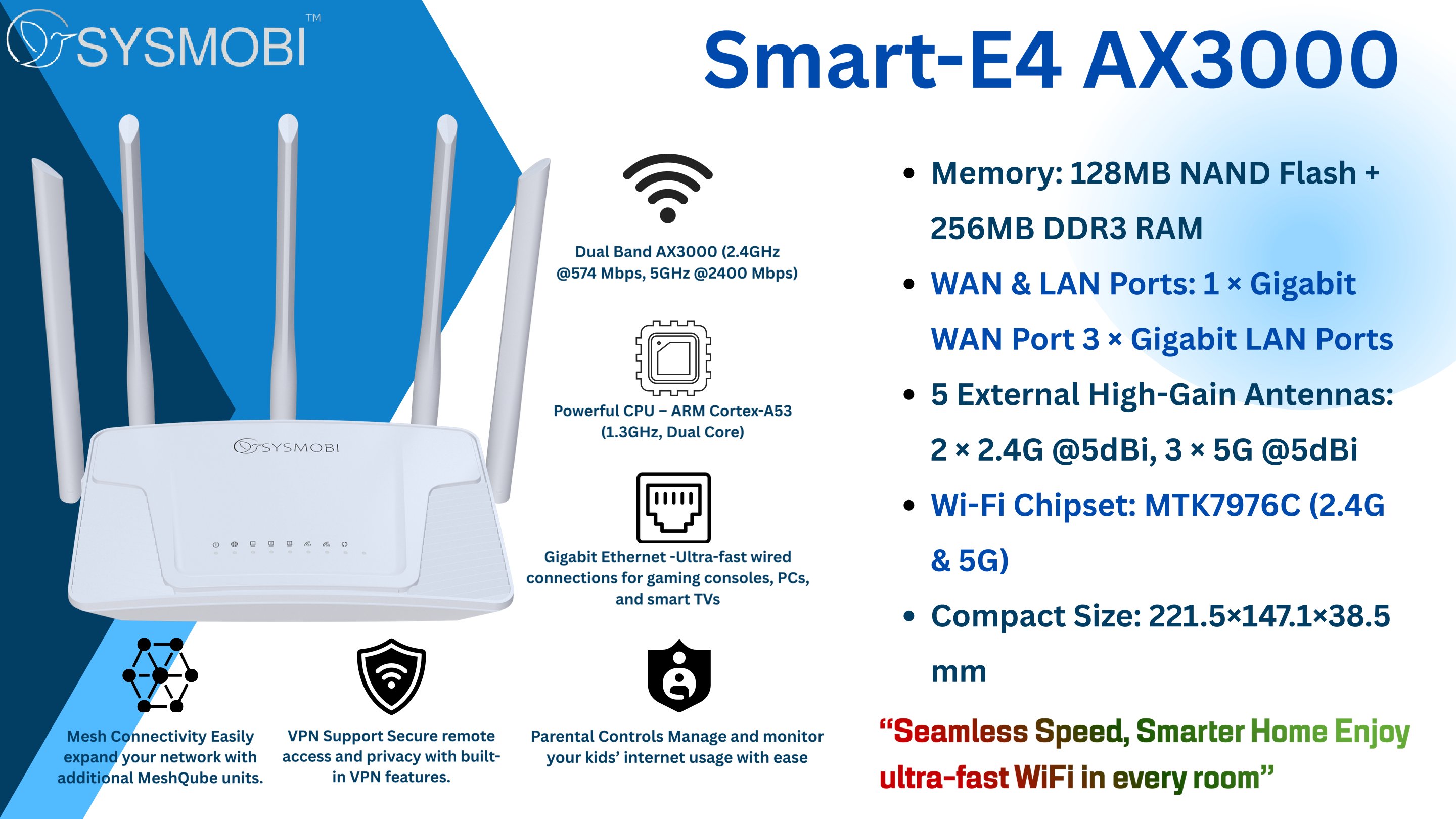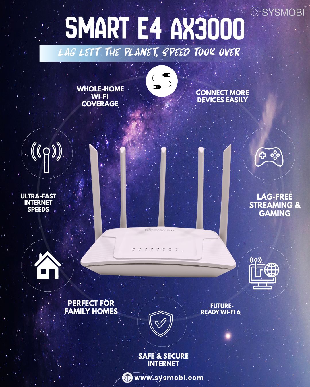 Experience next-level connectivity with our SMART series E4 - AX3000 Router, delivering ultra-fast speeds, seamless streaming, and lag-free gaming for every device in your home. Designed with advanced WiFi 6 technology 802.11ax with backward compatibility, it offers up to 3 Gbps of blazing-fast bandwidth and supports more simultaneous connections with greater efficiency. With enhanced range and coverage, this router ensures strong, reliable signals in every corner of your home, perfect for large households and multi-story spaces. Upgrade to smarter, faster, and wider-reaching WiFi today