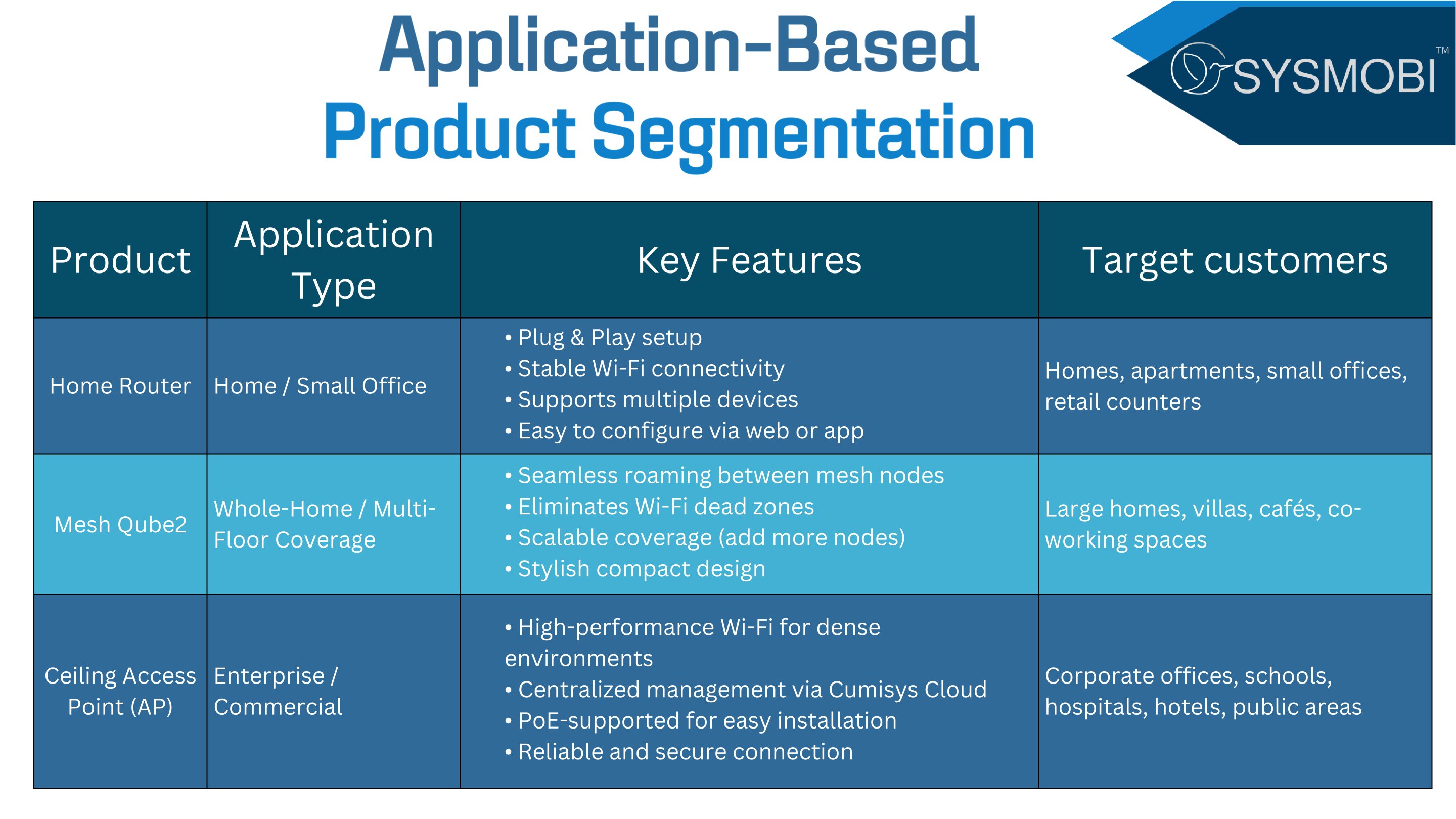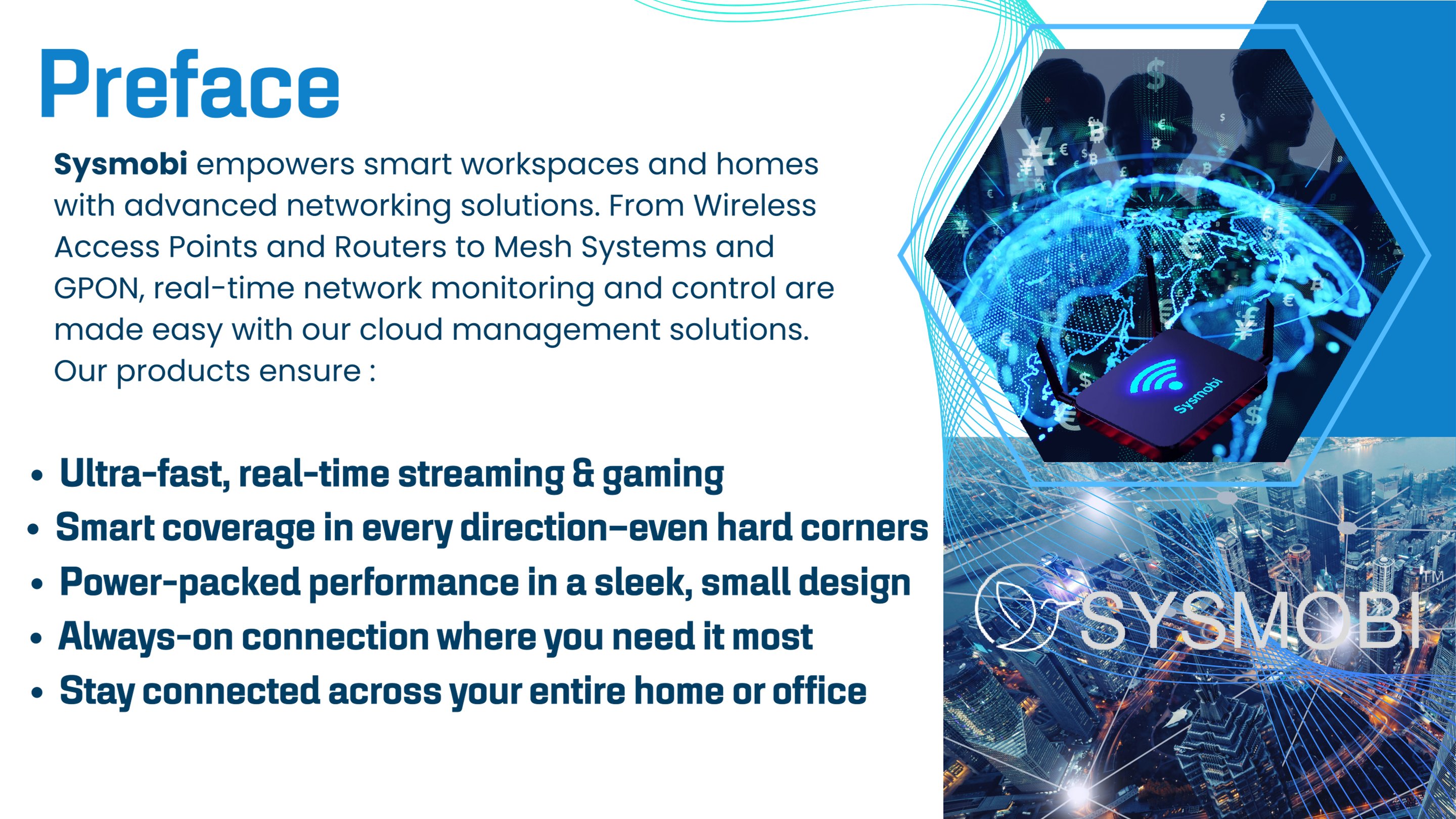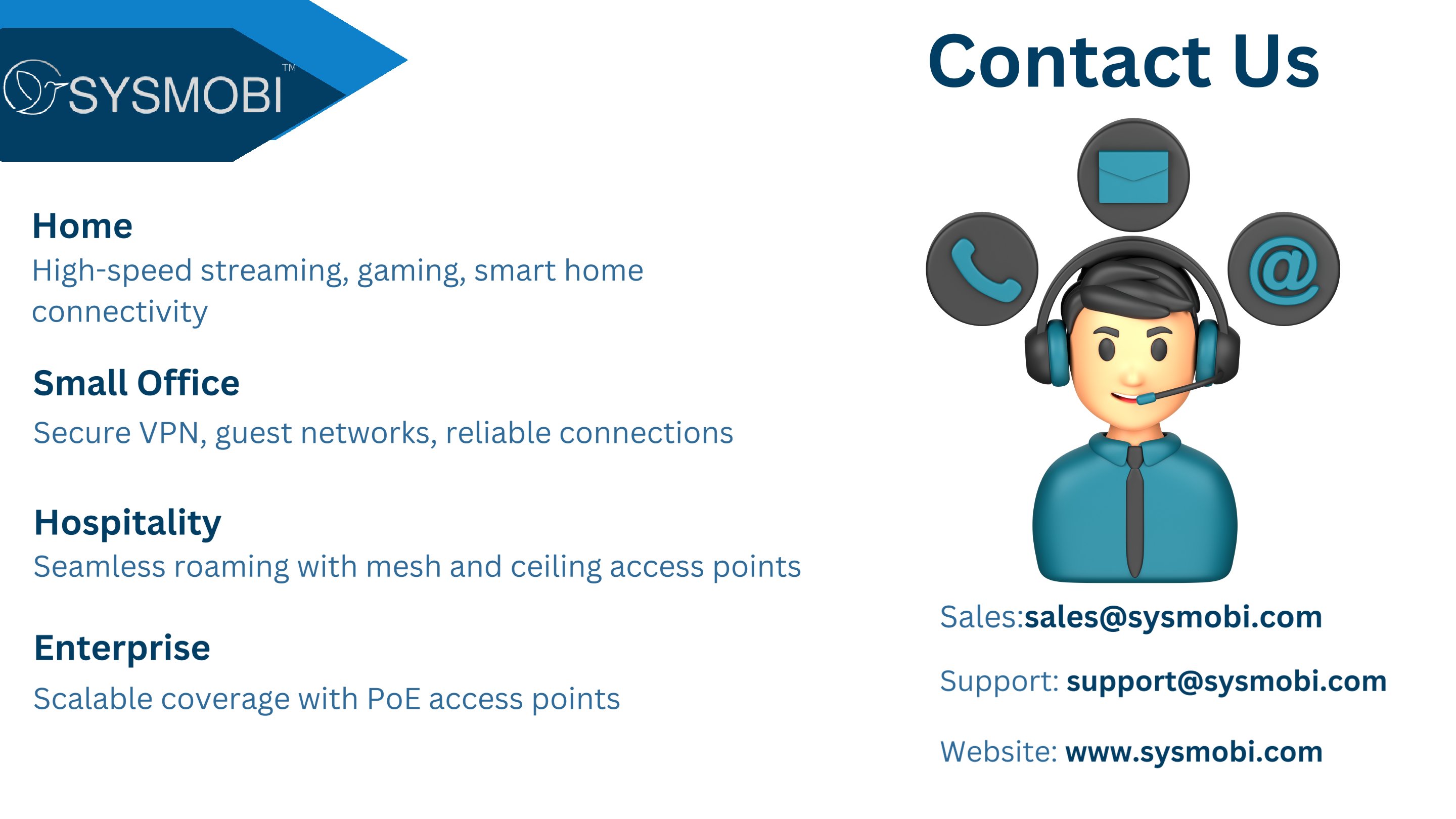 At Sysmobi, we design and manufacture high-performance wireless networking products tailored for unique demands of small offices and home users. With deep expertise in RF engineering and a passion for user-friendly design, we bring enterprise-grade stability in the SOHO world.