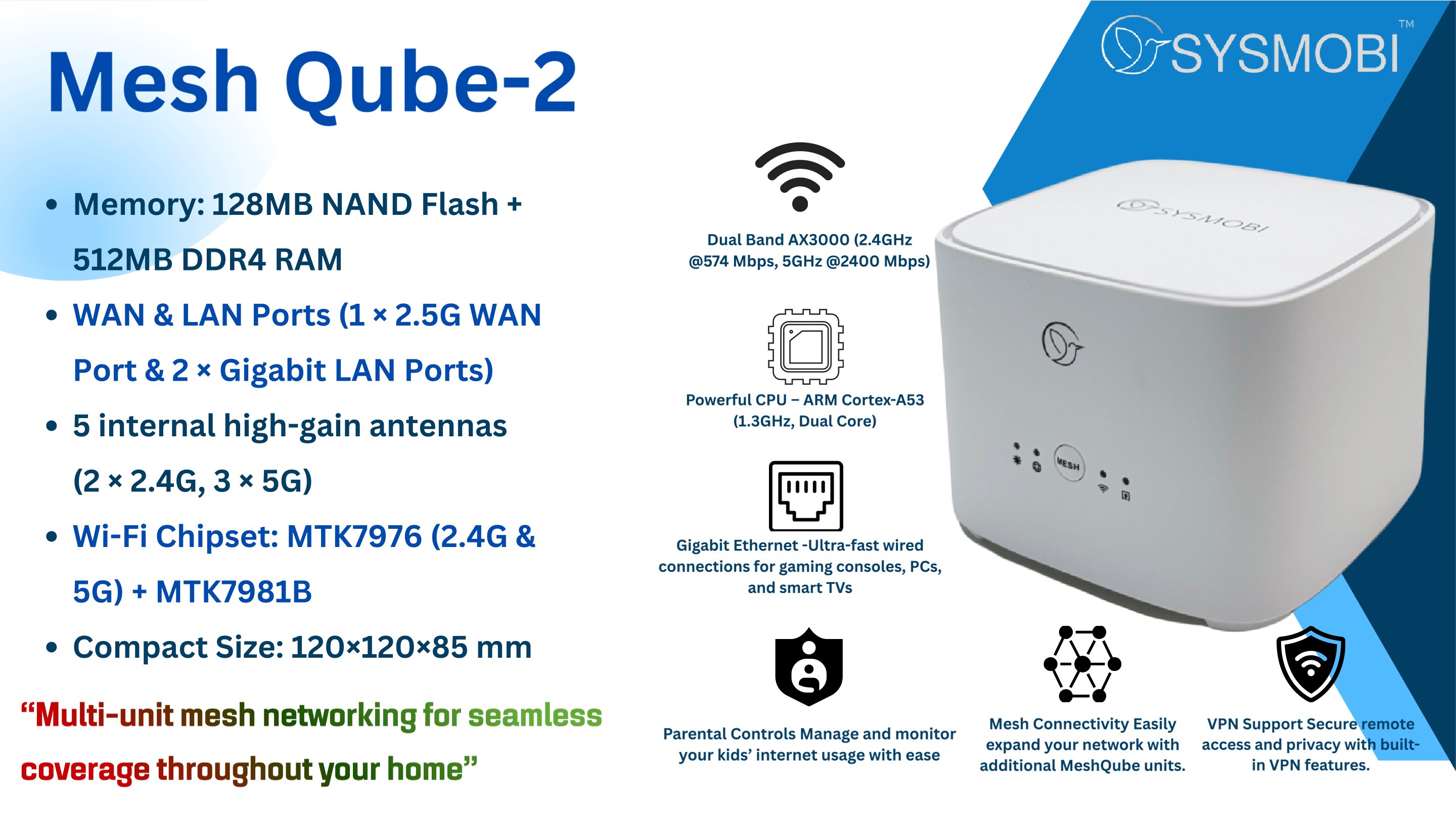 Transform your home into a high-speed smart network with our powerful MESHQUBE Router. Engineered for speed, coverage, and reliability, it delivers WiFi up to 3 Gbps with larger coverage and supports the latest WiFi 6 technology 802.11ax with backward compatibility for smoother streaming, faster downloads, and ultra-responsive gaming. With built-in Mesh support, you can easily connect multiple units to create a seamless, whole home network that eliminates dead zones and keeps every corner of your space connected. Perfect for large homes and busy households, this is WiFi that works smarter, faster, and everywhere you need it.